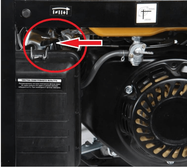 Произведите запуск генератора, используя ручной стартер или электростартер (в зависимости от комплектации конкретного электрогенератора). После того как двигатель генератора завелся, сразу же переведите рычажок управления дроссельной заслонкой в крайнее правое положение «открыто».